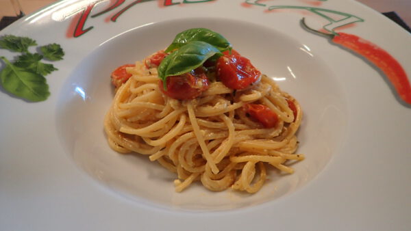 - Frischen Basilikum klein schneiden und vor dem Servieren über die Nudeln streuen.