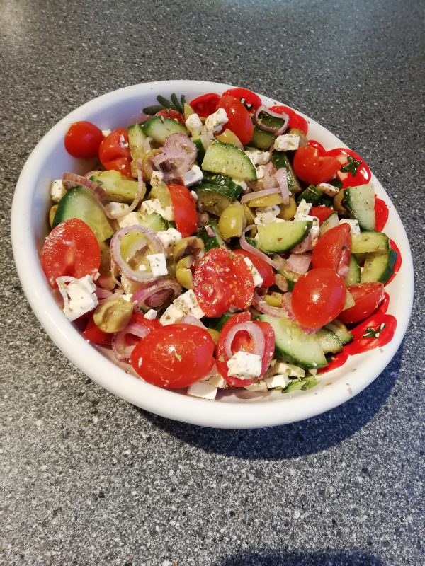 - Gurke in viertel Scheiben schneiden, Tomaten und Oliven halbieren, Zwiebel in halbe Ringe schneiden. Feta würfeln und alles zusammen vermengen.