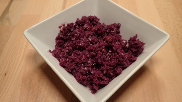 - In einem Topf Pflanzenfett erhitzen und die Zwiebeln, den Zucker sowie den Apfel andünsten. Blaukraut hinzugeben und sofort mit Essig übergießen. 10 Minuten zugedeckt dünsten.