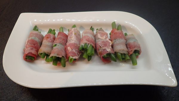 - Bohnen zu Bündeln aufteilen und je ein Bündel in eine halbe Scheibe Bacon einwickeln.