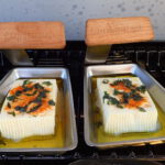 Feta halbieren, gut abtupfen und je eine Hälfte in ein Grillpfännchen geben.