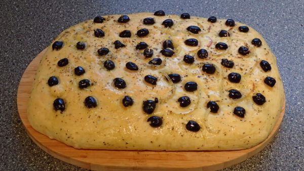 - Die Zutaten für den Belag nach Belieben zuschneiden (Oliven oder Tomaten halbieren, Feta würfeln, Zwiebeln in feine, halbe Ringe) und auf dem Teig verteilen und ggf. auch etwas mit den Fingern eindrücken und anschließend mit Kräutern bestreuen.