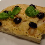 Die Zutaten für den Belag nach Belieben zuschneiden (Oliven oder Tomaten halbieren, Feta würfeln, Zwiebeln in feine, halbe Ringe) und auf dem Teig verteilen und ggf. auch etwas mit den Fingern eindrücken und anschließend mit Kräutern bestreuen.