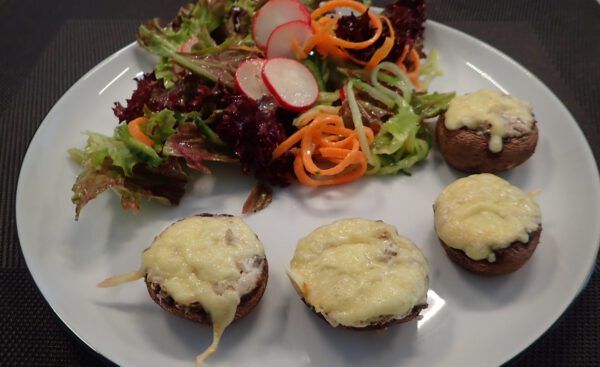 3. Champignonköpfe mit der Masse befüllen, in eine Auflaufform setzen und mit restlichem geriebenen Käse bestreuen. Bei 180°C / Umluft für 15 - 20 Minuten im Ofen backen.