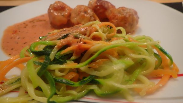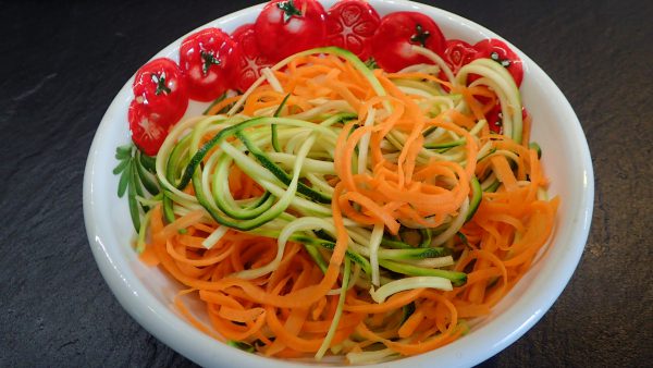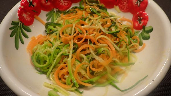 Zucchini und Karotten mit Hilfe eines Spiralschneiders in "Nudeln" schneiden.