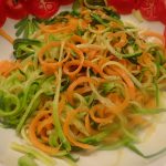 Zucchini und Karotten mit Hilfe eines Spiralschneiders in „Nudeln“ schneiden.