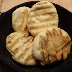 Den Teig etwas bemehlen und zu vier gleichgroßen Kugeln formen. Diese mit den Fingerknöcheln nun zu flachen Fladen formen.
