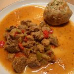 Tomatenmark und Paprikapulver zufügen und kurz anrösten, dann mit Rotwein ablöschen, kurz einkochen lassen und mit Fleischbrühe aufgießen. Die restlichen Gewürze hinzugeben und mit geschlossenem Deckel bei kleiner Hitze 1 Stunde schmoren lassen.