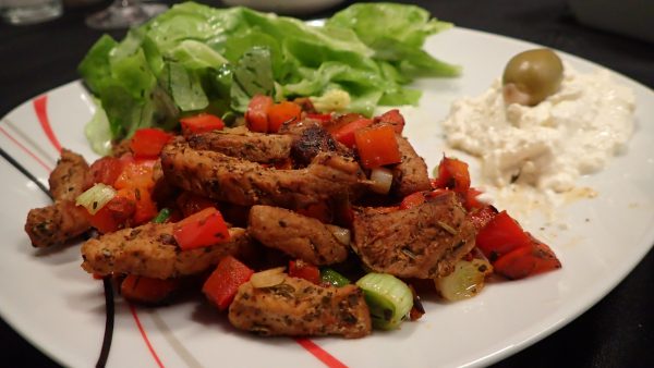 - Die Schnitzel waschen und in Streifen/Würfel schneiden. Den Knoblauch fein würfeln, die Zwiebel ebenfalls in Streifen schneiden und alles zusammen in eine Schüssel geben.