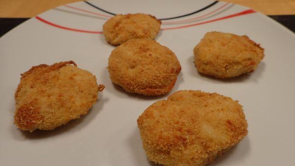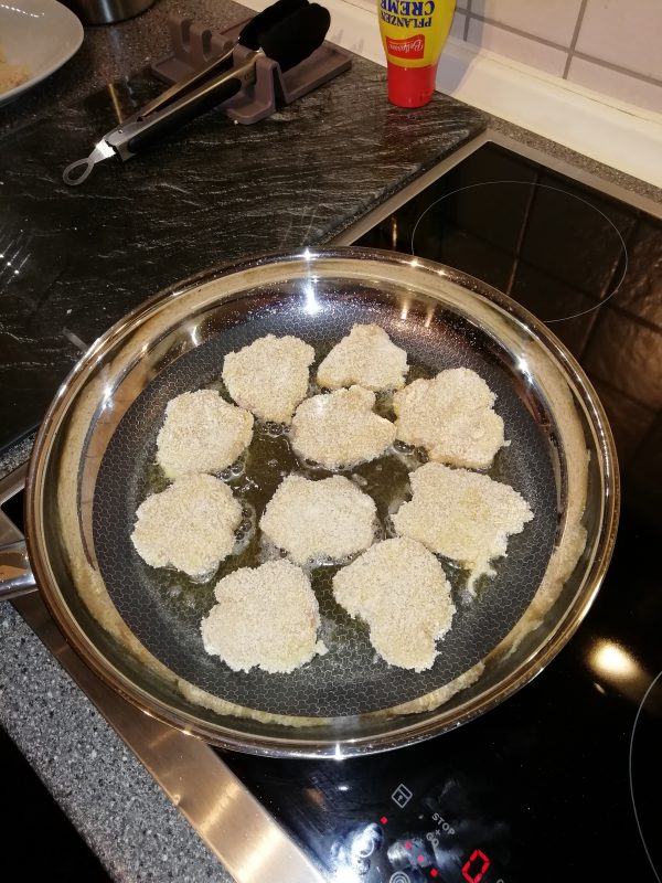 2. Mit angefeuchteten Händen kleine Nuggets formen und wie gewohnt panieren.