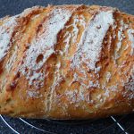 Eine Backmatte gut bemehlen (Teig ist sehr klebrig!) den Teig darauf geben, ebenfalls nochmal gut bemehlen und dann mehrmals zu einem Laib falten und schleifen. Den fertigen Laib in den bemehlten, nicht gewässerten Römertopf setzen und die Oberfläche noch einmal mit nassen Händen einreiben. Anschließend nach Belieben einschneiden und nochmals bemehlen.