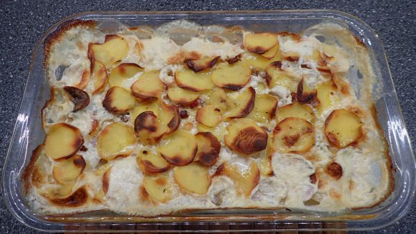3. Die Sahne mit der Milch vermischen und mit Gemüsebrühe, Kräutersalz, Muskat und Pfeffer kräftig würzen. Die Mischung über die Kartoffeln verteilen und alles bei 180°C / Ober-/Unterhitze für ca. 1 Stunde backen,