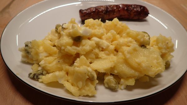 - Eier fein würfeln und Cornichons in Scheiben schneiden. Zu den Kartoffeln geben, alle vermengen und dann gut durchziehen lassen.