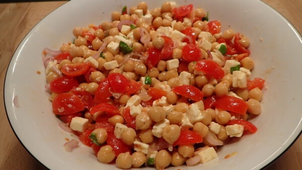 3. Zusammen mit den Kichererbsen in eine Schüssel geben und mit Salz und Pfeffer würzen.