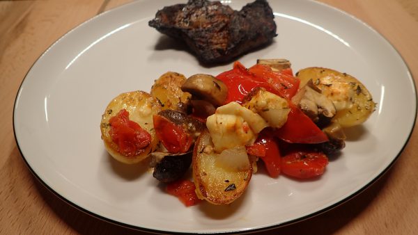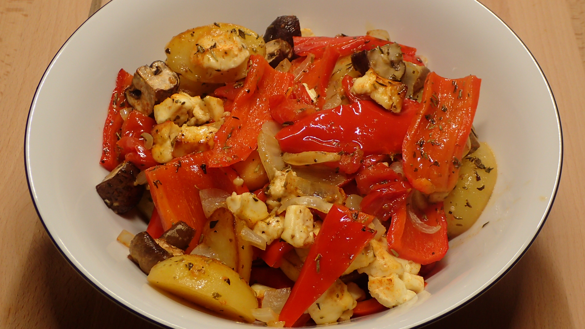 - Kartoffeln schälen und halbieren. Spitzpaprika halbieren und in grobe Stücke schneiden. Champignons je nach Größe vierteln oder halbieren. Datteltomaten halbieren, Zwiebel in grobe Würfel schneiden, Knoblauch halbieren oder kleine Zehen im Ganzen lassen. Feta würfeln.