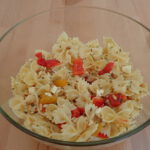 Feta ebenfalls in Würfel schneiden und zusammen mit Pinienkernen und Paprika unter die Nudeln mischen.