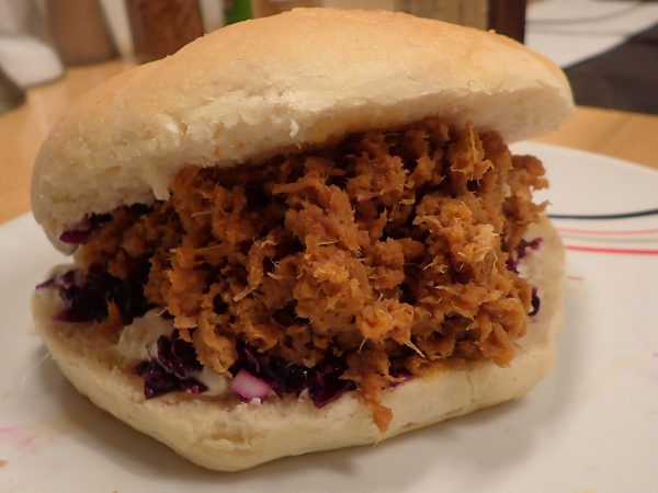 Als Pulled Pork Burger in einem Fladenbrot mit Sour Cream und Rotkohlsalat servieren.