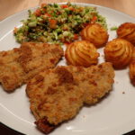 Schinkenschnitzel etwas flacher klopfen und ggf. in der Mitte halbieren. Mit Salz, Pfeffer und Paprikapulver würzen und wie gewohnt panieren.