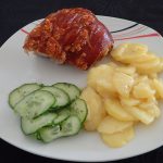Kurz bevor die Zeit um ist, den Ofen auf 200°C Ober-/Unterhitze vorheizen. Die Haxen aus dem Wasser nehmen, abtropfen lassen, auf ein Backblech setzen und 60 Min. knusprig braten. Dann noch einmal für 15 Min. auf 200-220°C Umluft-Grill schalten.