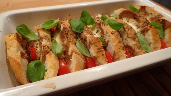 - Eine kleine Auflaufform mit etwas Olivenöl ausstreichen und der Länge nach abwechselnd Brot, Tomate und Mozzarella einschichten. Dabei jeweils mit einer Scheiber Brot anfangen und abschließen.