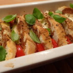Eine kleine Auflaufform mit etwas Olivenöl ausstreichen und der Länge nach abwechselnd Brot, Tomate und Mozzarella einschichten. Dabei jeweils mit einer Scheiber Brot anfangen und abschließen.