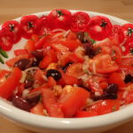 Tomaten würfeln, Zwiebel in viertel Ringe schneiden und Oliven ggf. entsteinen. Alles zusammen in eine Schüssel geben.