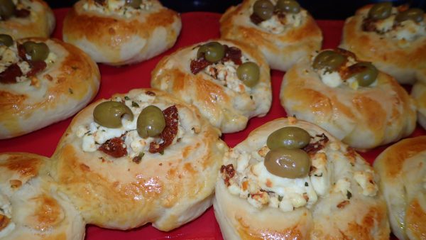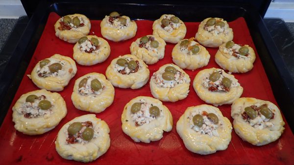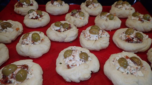 4. Den Feta mit Petersilie und kleingeschnittenen Tomaten mischen und in die Vertiefungen füllen. Anschließend die Oliven halbieren und je zwei Hälften darauf legen. Dann für weitere 15 Minuten gehen lassen.