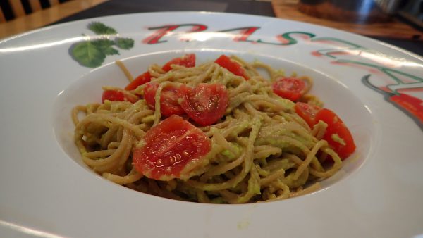- Das Pesto unter die Spaghetti heben und die halbierten Tomaten untermengen.